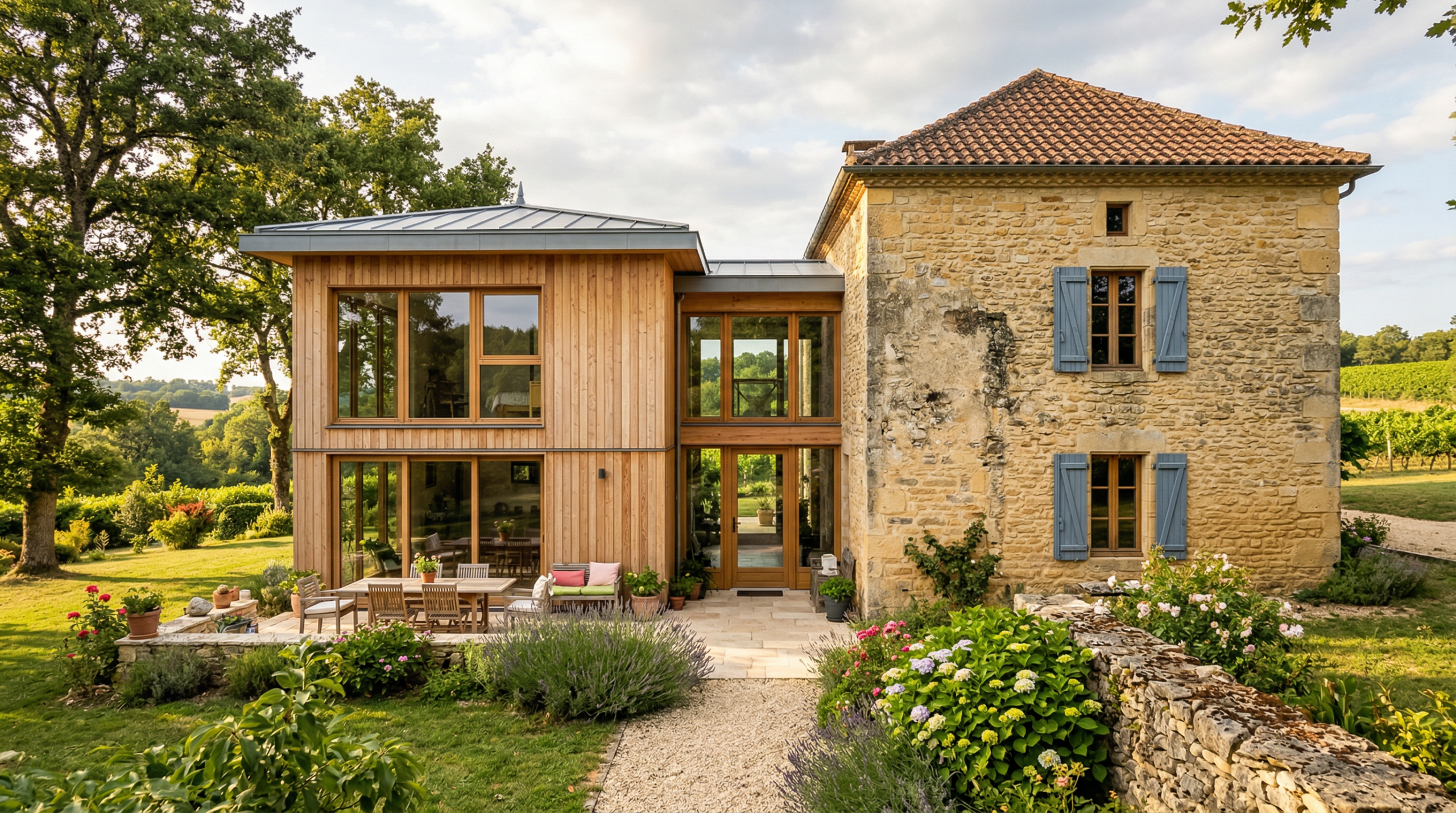 C’est souvent une surprise pour nos clients : une extension ossature bois se pose très bien sur une maison en pierre. La structure bois est légère — bien plus légère que la maçonnerie traditionnelle — ce qui limite les contraintes sur les fondations existantes. Et le résultat est visuellement très réussi : le mariage bois-pierre est une signature architecturale du Périgord, et nos équipes savent en tirer le meilleur parti.